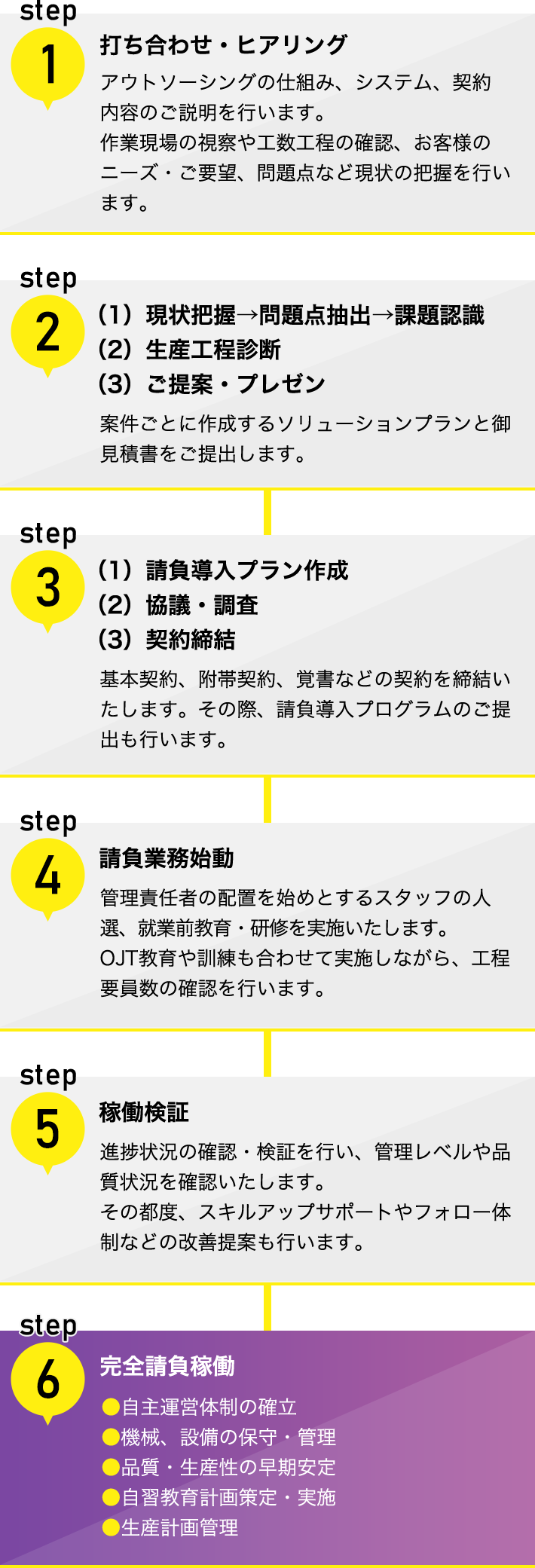 製造業務や一般業務などの問題ポイントを請け負う(工程請負)と、業務の全体を請け負う(一括請負)があり、お客様が処理されていた業務を専門的な技術やノウハウを持った企業に外部委託(アウトソーシング)することをいいます。
